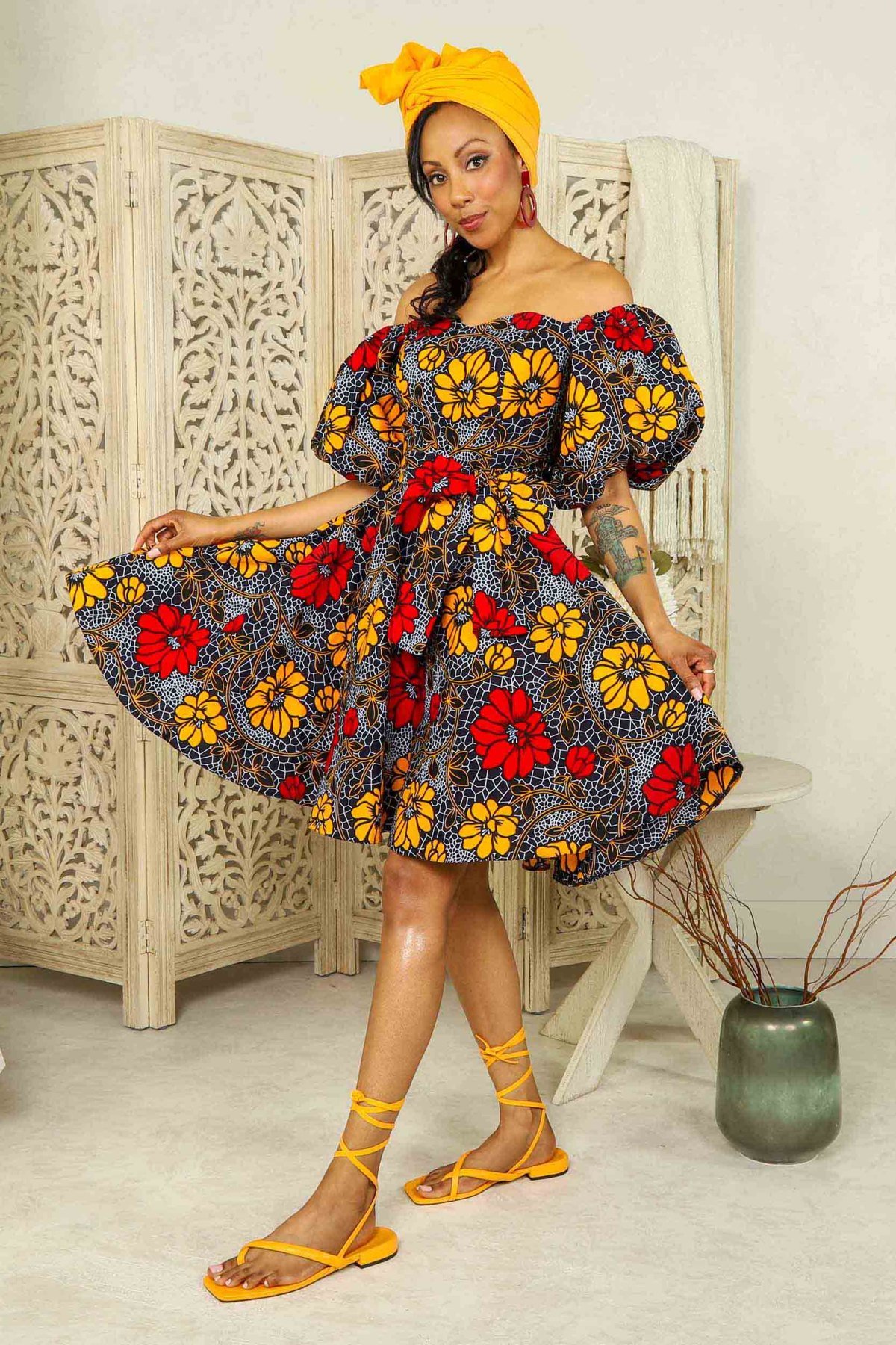 African Print Mini Dress with Puff Sleeves